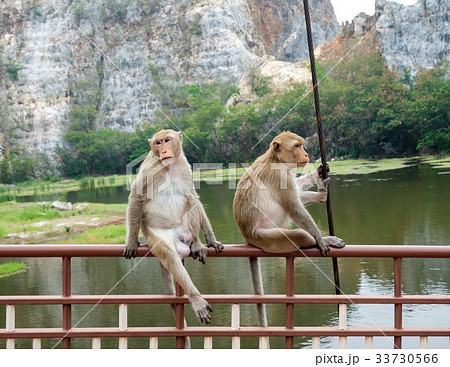 Two young monkeys sitting on rail