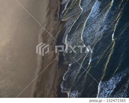 A dramatic morning seascape where rolling blue waves meet dark sands under a cloudy, golden horizon. This tranquil scene evokes a sense of renewal, perfect for wellness or travel content.