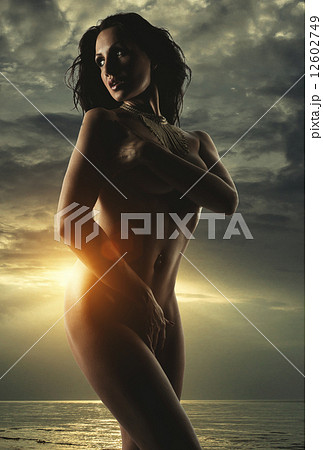Naked woman against cloudy moody sky and sea