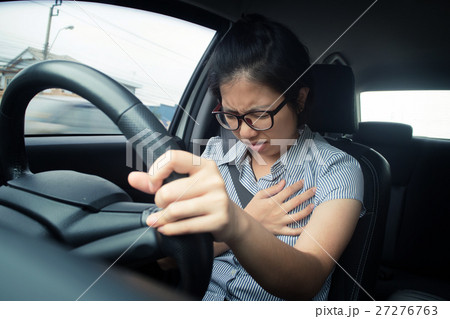 Senior Asian woman sitting on the sofa and having an chest pain indoors.