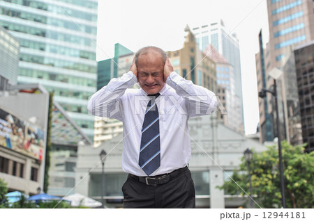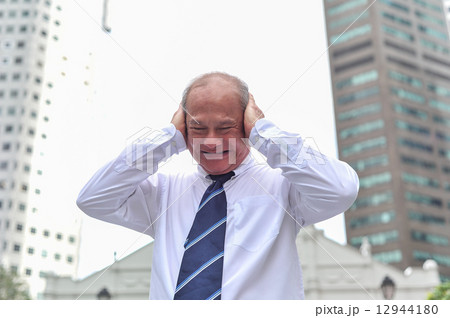 Portrait of an mature balding mature businessman, wearing a shirt and a necktie, in pain