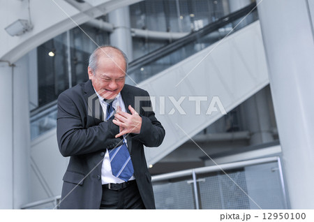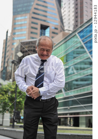 Profile portrait of a mature balding businessman, wearing a suit and a necktie, suffering in pain