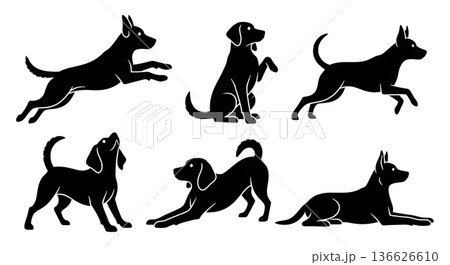 Black Solid Playful Dog Stances Silhouettes Set of Six on White Background