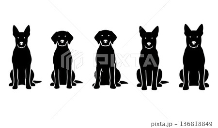 Black Solid Dog Sitting Patiently Silhouettes Set of Six on White Background