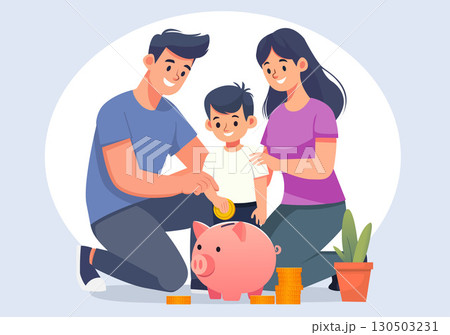 Flat illustration of parents teaching their son to save money