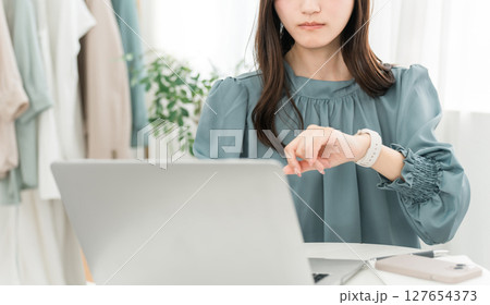 年輕的亞洲女商人在筆記型電腦前看著手錶,感到沮喪