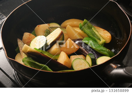 在鐵板上翻炒肉、蔬菜和烏龍麵