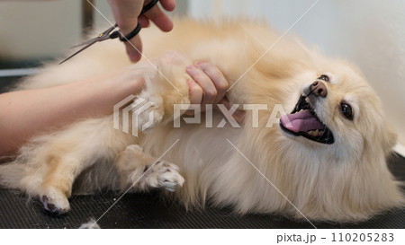 Dog getting hair cut and beauty procedures in salon