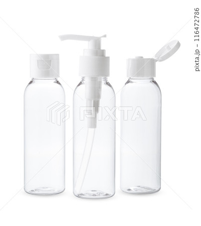 Three Clear Plastic Bottles With White Caps and Pumps on a White Background