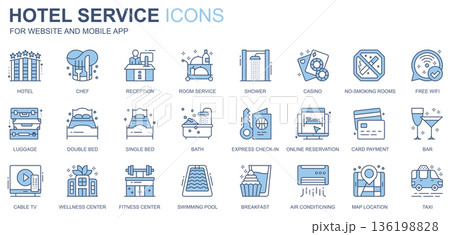 Hotel service web icons set in duotone line design. Pack of chef, reception, room, shower, casino, no smoking, free wifi, double bed, checkin, other outline stroke pictograms. Vector illustration