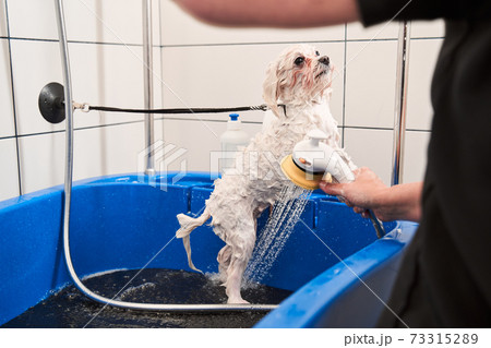 White maltipoo pet getting shower before hair cutting