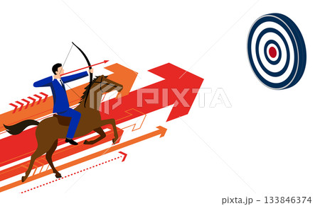 新年插圖。扁平化插畫,描繪一位商人騎馬,手持弓箭,紅色箭矢,向量圖。