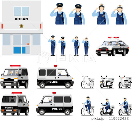 警亭、警員和巡邏車套裝_警察、警員、汽車、摩托車、自行車