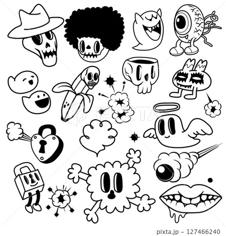 Doodle, illustration of cartoon monsters and cartoons on an yellow background, in the style of black and white abstraction