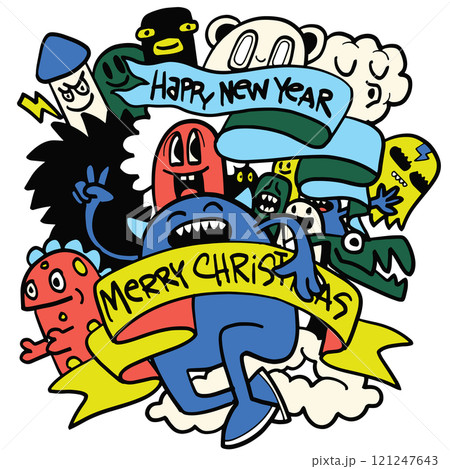 Colorful cartoon monsters celebrate holidays with Happy New Year and Merry Christmas banners, creating fun and festive atmosphere