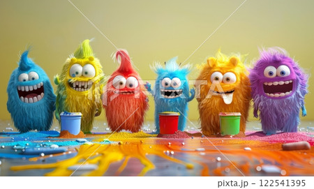Colorful monsters paint fun playful cute cartoon characters animation kids happy joyful creative