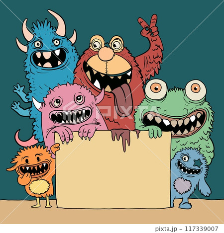 Cheerful Cartoon Monsters Holding Blank Sign in Whimsical Art