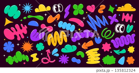 Abstract groovy shapes, funky stickers and graphic retro elements with comic bubbles, cartoon vector. Groovy Y2K shapes of eyes emoji, twisted arrows with clouds, zigzags and bizarre shape elements