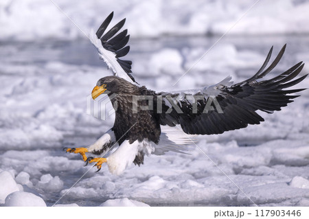 一隻在流冰上起舞的巨鷹北海道鄂霍次克海