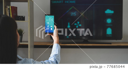 A young woman is using a smartphone with a controlled application. Smart home concept.
