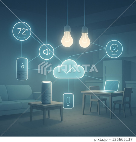 Smart home devices connected in network, featuring digital assistant, smart thermostat, and security camera in modern living room. scene is illuminated by smart bulbs