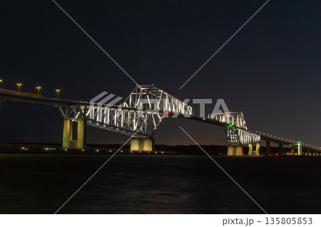 夜幕下的東京門大橋和東京灣,在夜空的映襯下閃耀著藍色的光芒,倒映在水中。
