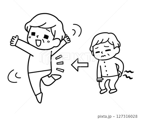 一位患有背痛的中年婦女,以及她病情好轉後開心微笑的前後照片(單色)
