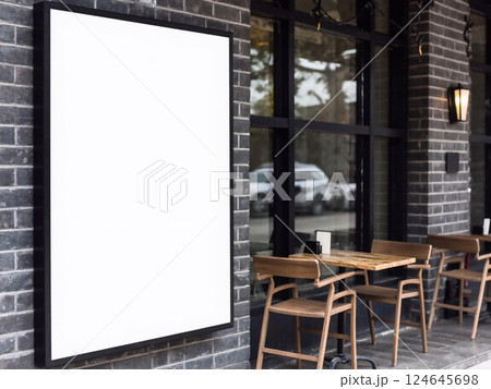 White paper poster mockup displayed outside the building restaurant. Marketing and business concept.