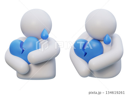 3D Claymorphism Sad White Stickman Crying and Hugging Broken Blue Heart