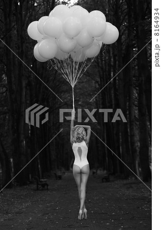 Melancholy. Lonely Woman with Balloons in Dark and Gloomy Forest