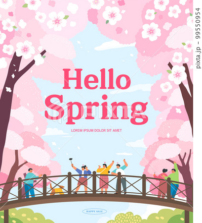 黃昏時分,一男一女站在橋上,背景是櫻花盛開的景象