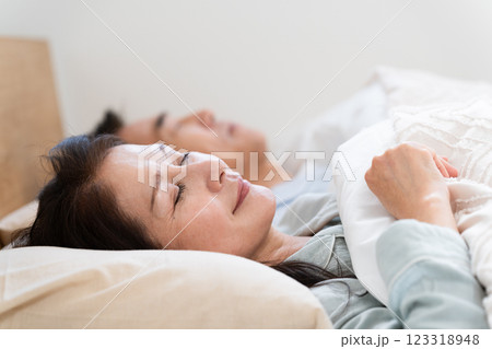 一對睡得香甜舒適、醒來感覺良好的夫妻(起床、上床睡覺、睡覺)