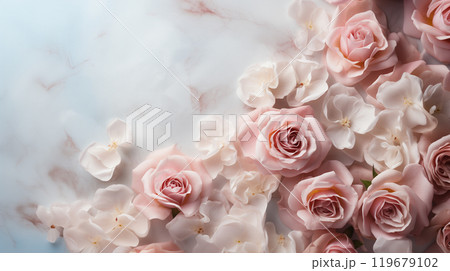 Background with peach-colored rose petals and flowers on a light background. Valentine's Day, International Women's Day.