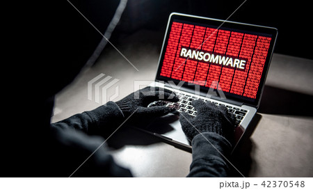 Hacker hand on laptop, ransomware attack screen