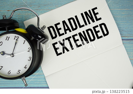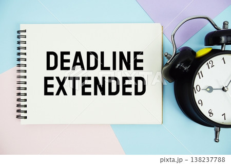 Deadline Extended text written on notepad with pen and alarm clock