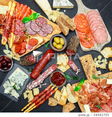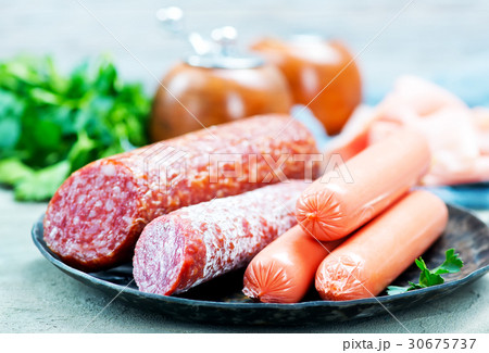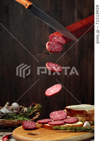 Traditional smoked salami sausage, on black dark stone background, with copy space for text