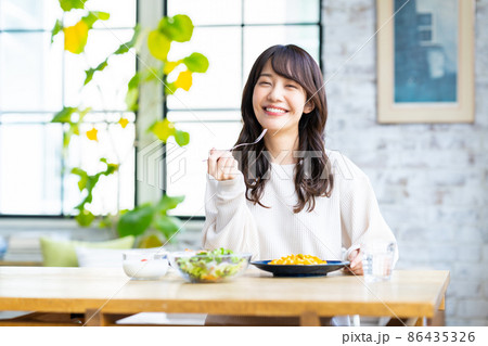 在家吃意大利面的年輕女人