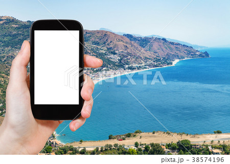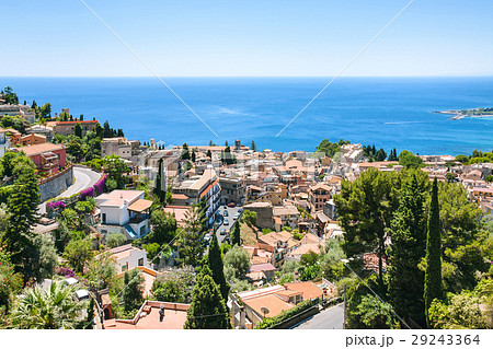 view on Taormina - tourist resort on mountain and Giardini Naxos beach, Sicily