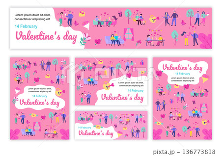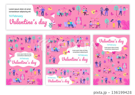 Valentines day poster and banner templates set. Men and women in love go on romantic date, giving gifts, celebrating holiday. Cover brochure with tiny people in flat design. Vector illustration.