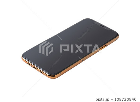 A mockup of the 2023 modern phone in gold with a blank white screen isolated on a white background. Mockup your phone for mockup and demonstration of the app.