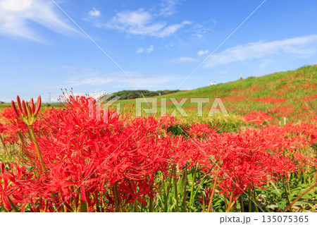 秋日景色,愛知縣半田市,村莊裡盛開著紅色的彼岸花。