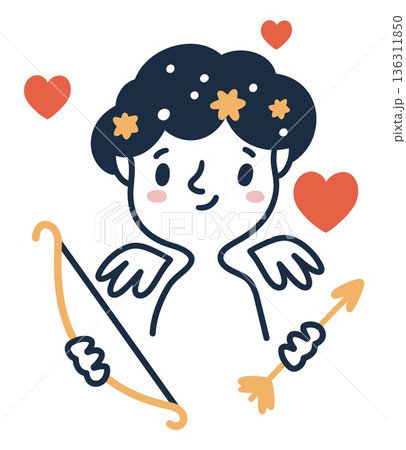 Cute Cupid with bow and arrows. Symbol of love. Cherub aiming with longbow. Amur face. Heart of romance. Kid angel with wings. Valentine amour. Vector cartoon fictional angelic character