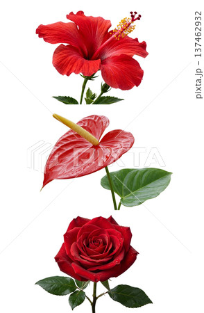 Stunning collection of red flowers including tropical hibiscus, glossy anthurium, romantic rose, isolated on white for botanical designs