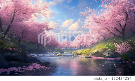 溪流,櫻花,春天,插圖,背景,素材