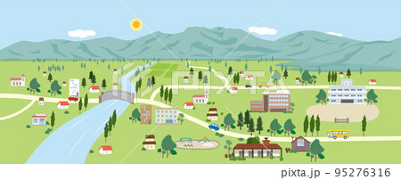 與山、河和城鎮的風景背景例證