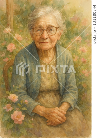 花園中微笑的慈祥老奶奶插畫
