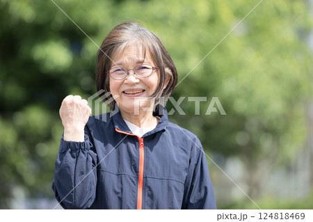 保持健康,多運動!拳頭泵老年婦女的健康形像看著相機