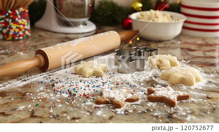 A warm Christmas baking scene with rolling pin, cookie dough, cookie cutters in festive shapes, flour-dusted countertop, and scattered sprinkles, ready for holiday baking. AI generated.