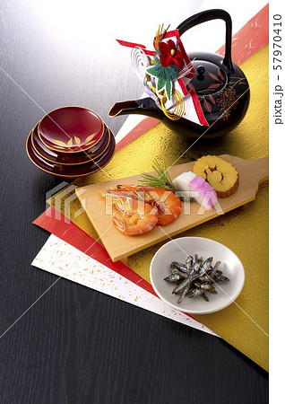 新年/新年慶祝菜餚 - 手寫日式/線條畫插圖集新年菜餚、慶祝鯛魚和 toso