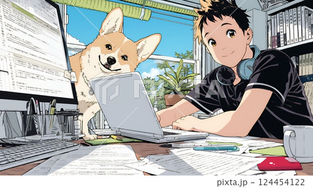 一位中年婦女正在使用電腦,旁邊還有她的寵物狗。這是一張在家工作的圖片。